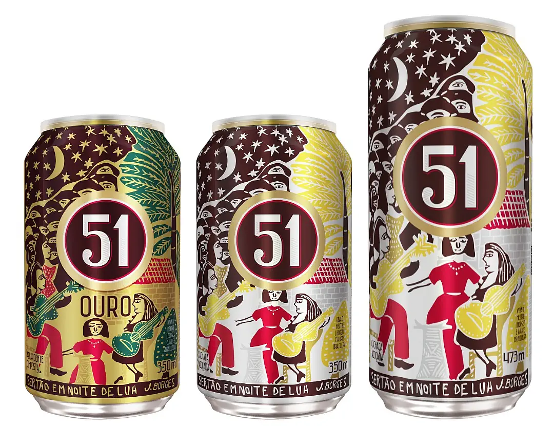 Desde 2019 trabalhamos com a arte de J. Borges nas nossas embalagens comemorativas de São João. O processo de produção envolve a área criativa e o estúdio J. Borges para concepção do projeto. Nossa linha de produção conta com recursos técnicos modernos capazes de transformar a xilogravura em embalagens incríveis. Essa infraestrutura permitiu preservar a força dos traços, a vivacidade das cores e o acabamento dourado que faz da lata um item colecionável. São 4 produtos que fazem parte do conjunto embalagens comemorativas de São João: Cachaça 51 Branca em garrafa de 965ml, em lata de 350ml e lata de 473ml, além da nossa grande vencedora: Cachaça 51 Ouro em lata de 350ml.
