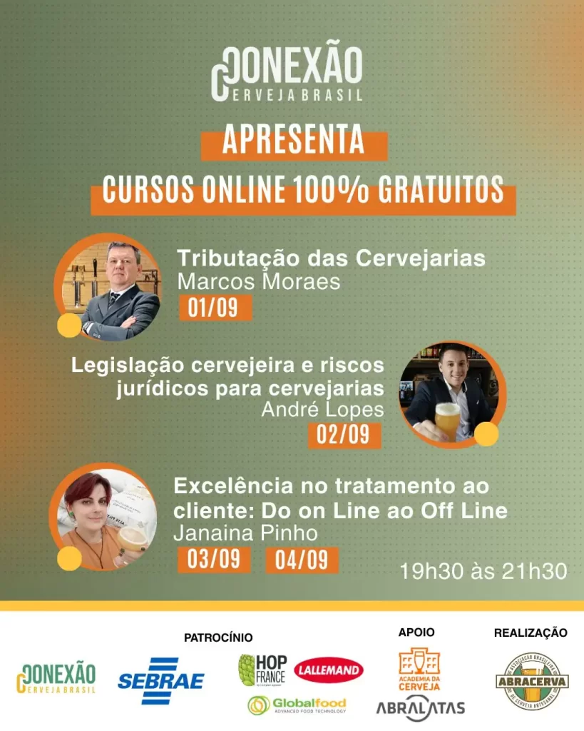 A Associação Brasileira de Cerveja Artesanal (Abracerva) inicia em setembro uma série de cursos online e gratuitos dentro do projeto Conexão Cerveja Brasil, reunindo especialistas em cinco áreas do mercado cervejeiro: Jurídico, Comercial, Marketing, Hospitalidade e Serviço, e Gestão. A primeira aula acontece já nesta segunda-feira, 1º de setembro, com o advogado tributarista Marcos Moraes, Conselheiro Tributário da entidade, abordando a tributação das cervejarias. Os encontros serão transmitidos ao vivo, das 19h30 às 21h30, sem necessidade de inscrição prévia (basta acessar aqui). Entre os nomes confirmados estão ainda André Lopes, diretor jurídico da Abracerva e autor do primeiro livro sobre direito da cerveja, Janaina Pinho, estrategista comercial e idealizadora do Projeto Sirva-se, Filipe Bortolini, presidente da Associação Gaúcha de Microcervejarias, além de Aline Ferreira, juíza internacional de cervejas, e Francesca Sanci, consultora e coautora de O Livro da Cerveja. Com patrocínio de Sebrae, Globalfood, Hop France e Lallemand, e apoio da Academia da Cerveja e da Abralatas, a iniciativa busca promover atualização técnica, troca de experiências e integração entre profissionais e entusiastas em todo o país. Mais informações no site oficial ou Instagram da Abracerva.