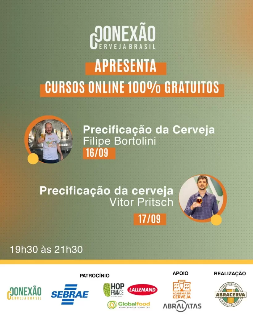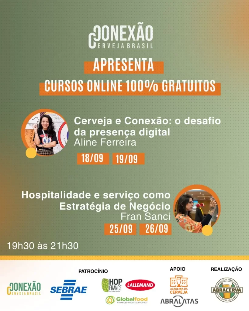 A programação, que já contou com palestras do advogado tributarista Marcos Moraes e do advogado André Lopes, segue no dia 16 com o curso “Precificação da cerveja”, ministrado por Filipe Bortolini e Vitor Pritsch; nos dias 18 e 19, Aline Ferreira aborda marketing e presença digital; e nos dias 25 e 26, Francesca Sanci encerra a série com foco em hospitalidade e serviço. Patrocinado por Sebrae, Globalfood, Hop France e Lallemand, com apoio da Academia da Cerveja e Abralatas, o projeto complementa o circuito presencial do Conexão Cerveja Brasil, que neste mês terá etapa em Porto Alegre entre 10 e 13 de setembro.
