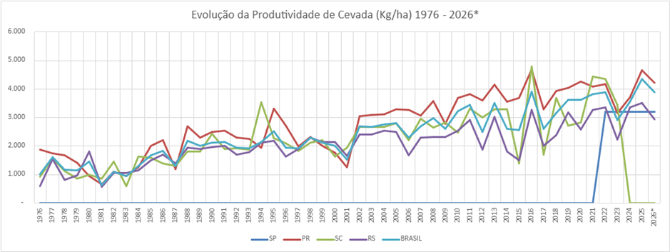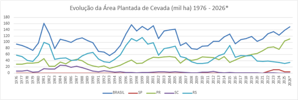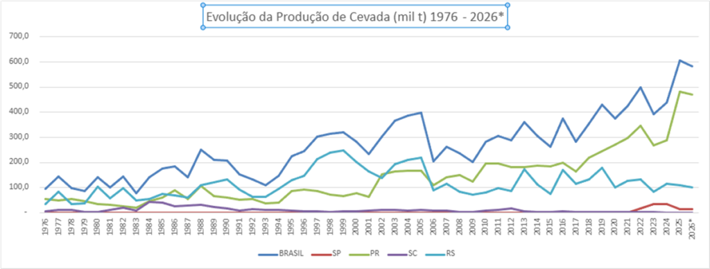 A produção de cevada no Brasil mostra tendência de crescimento em toda a série histórica, chegou perto de 400 mil toneladas em 2005, mas depois teve forte queda no ano seguinte, ficando perto das 200 mil toneladas. A retomada do crescimento se viu a partir de 2009 até o recorde de produção em 2025 com 600 mil toneladas, representando a multiplicação por 3 vezes da produção. A safra esperada para 2026 é de 584 mil toneladas. Novamente na análise especial mostra-se a forte liderança do Paraná desde 2006 e para 2026 espera mais de 80% da produção nacional com 469 mil toneladas, o Rio Grande do Sul já teve 77% do total da produção em 1999, mas hoje tem apenas 17% com 101 mil toneladas e São Paulo com 13 mil toneladas tem apenas 2%.