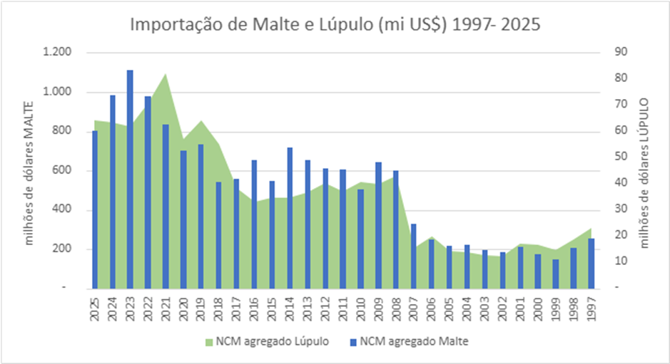 A parir desses dados é possível estabelecer período de estabilidade bem definidos, entre 1997-2006 a média de importação do agregado malte esteve em 207mo US$ e do agregado lúpulo 16miU$$, para o período 2007-2016 o malte cresceu 184% atingindo uma média de 587miUS$, já o lúpulo cresceu 117% alcançando 36miUS$ de média, no último período analisado, 2017-2025, o malte cresceu 37% para marca de 805miUS$ de média e o lúpulo avançou 74% para casa de 62miUS$ de média. Essas variações têm nítida relação com a produção de cerveja e as flutuações econômicas, tais como crises cambiais e creditícias, e além da já conhecida proximidade com o poder de compra do trabalhador brasileiro, motor do mercado nacional de cerveja. Por fim, a importação de insumos no Brasil movimentou R$ 4,5 bilhões em 2025.